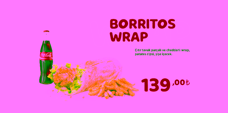 • 1 Borritos Wrap: Çıtır tavuk parçaları ve cheddar peyniri ile hazırlanan lezzetli ve doyurucu wrap.