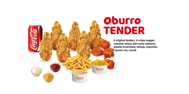 Oburro Tender Menü, çıtır tavuk parçaları ve nugget lezzetlerini bol porsiyon yan ürünlerle birleştirerek tam bir doygunluk sağlar. Sade ve çıtır lezzetlerden vazgeçemeyenler için ideal bir seçenektir.